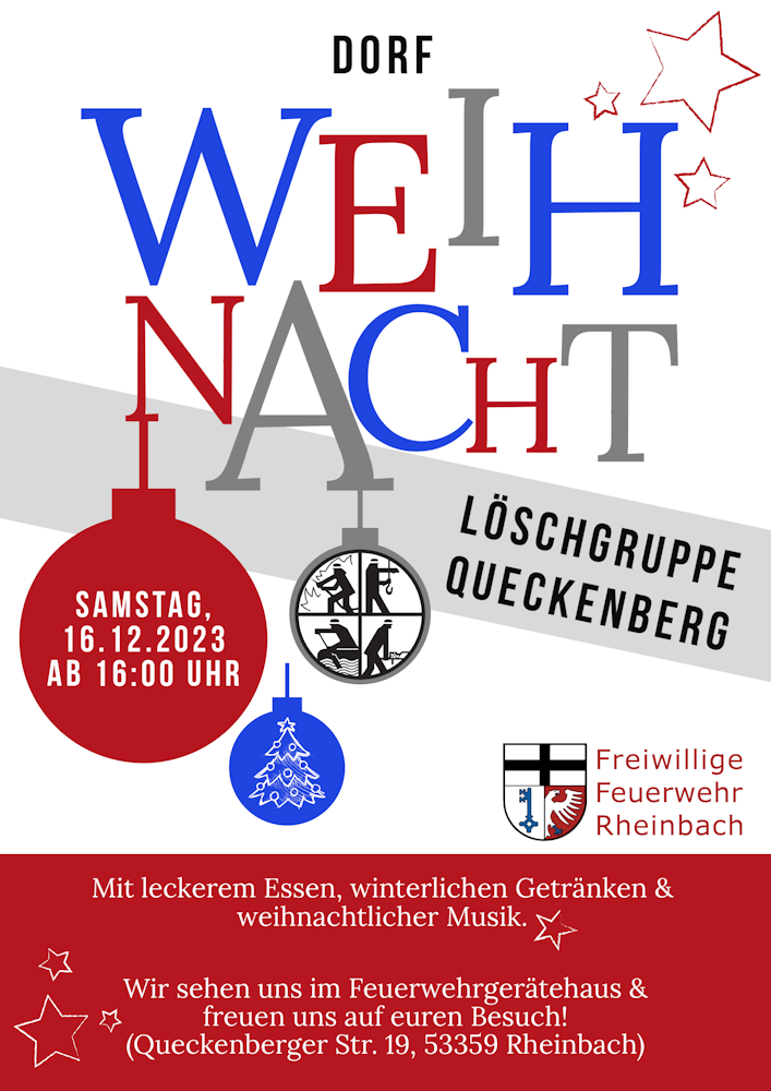 Am Samstag, dem 16. Dezember 2023 lädt die Löschgruppe Queckenberg zur traditionellen Dorfweihnacht am Queckenberger Feuerwehrgerätehaus ein.