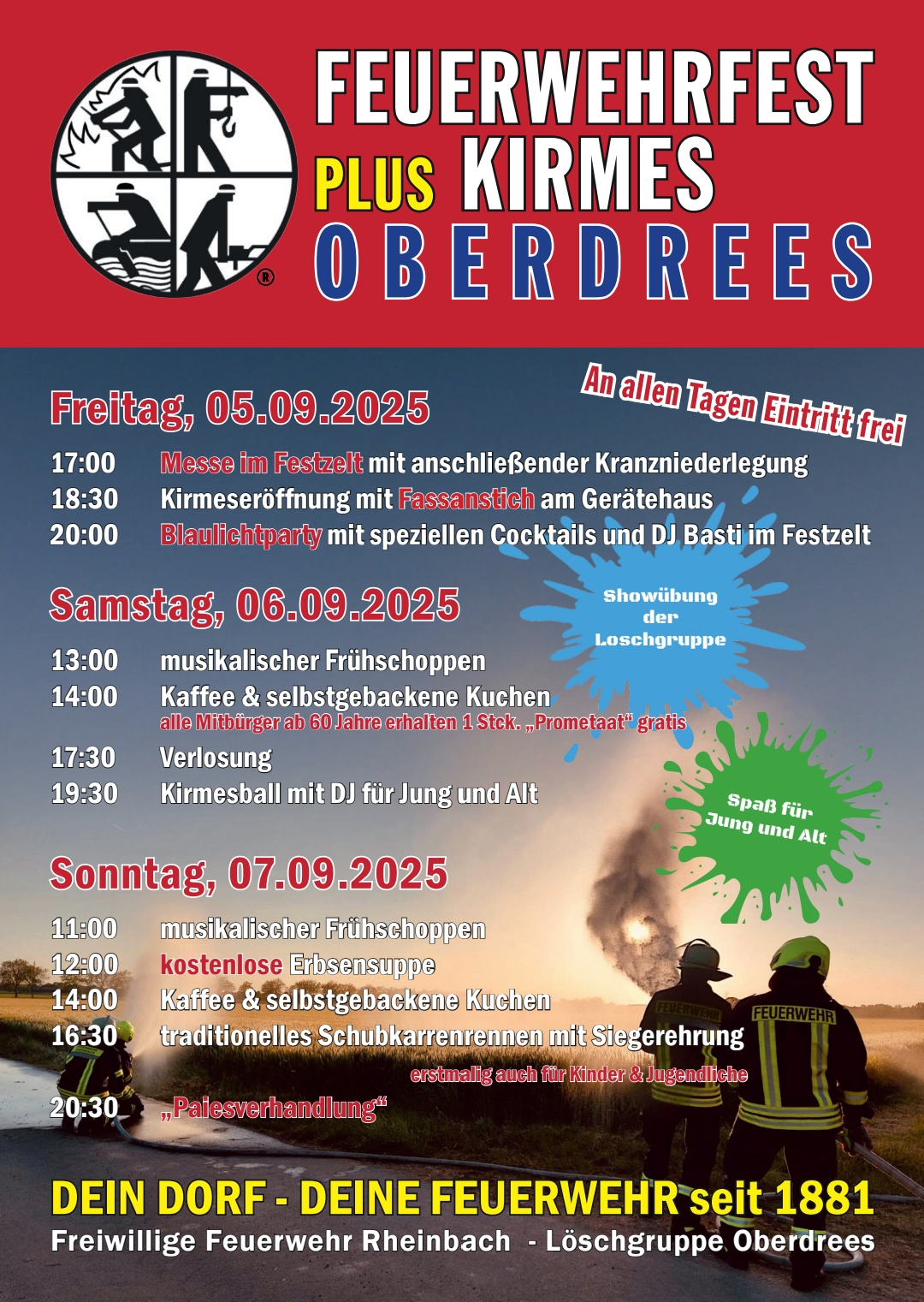Von Freitag, dem 5. September bis Sonntag, dem 7. September 2025 findet das diesjährige Feuerwehrfest zusammen mit der Kirmes in Oberdrees statt.