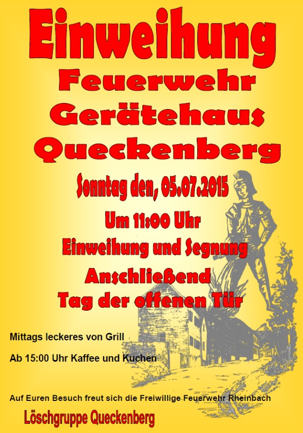 Am Sonntag, dem 5. Juli 2015 wird das Feuerwehrgerätehaus in Queckenberg eingeweiht. Zudem lädt die Löschgruppe Queckenberg zu einem Tag der offenen Tür.