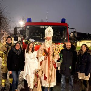 Bei der Nikolauswanderung des Kindergartens St. Josef in Wormersdorf setzte der Nikolaus auf ein außergewöhnliches Verkehrsmittel: zur Begeisterung der Kinder fuhr der heilige Mann mit dem großen roten Feuerwehrauto der ortsansässigen Löschgruppe vor.