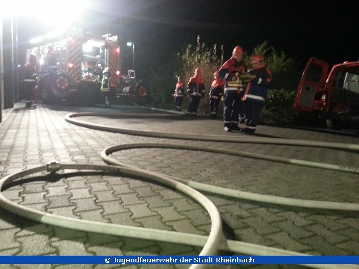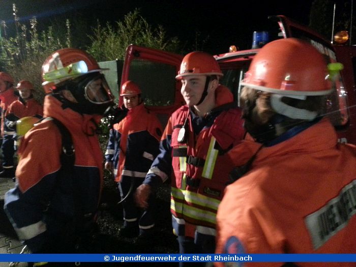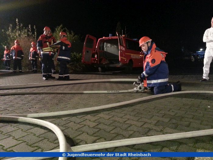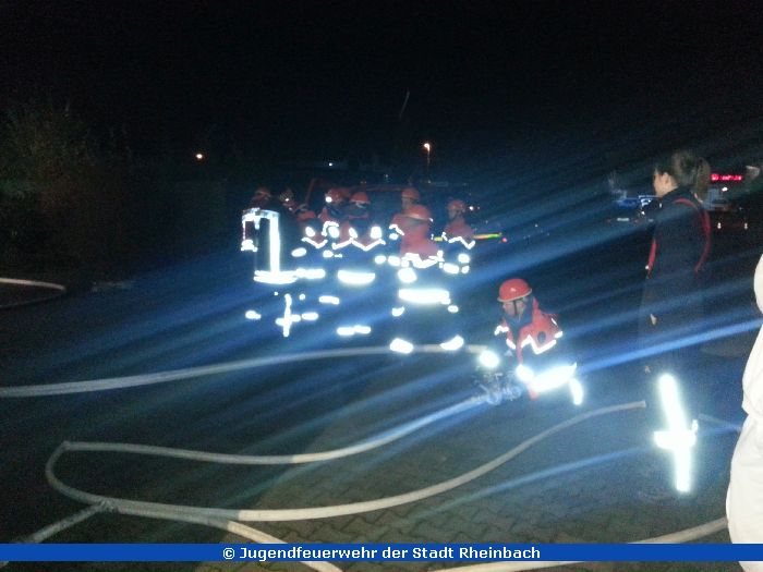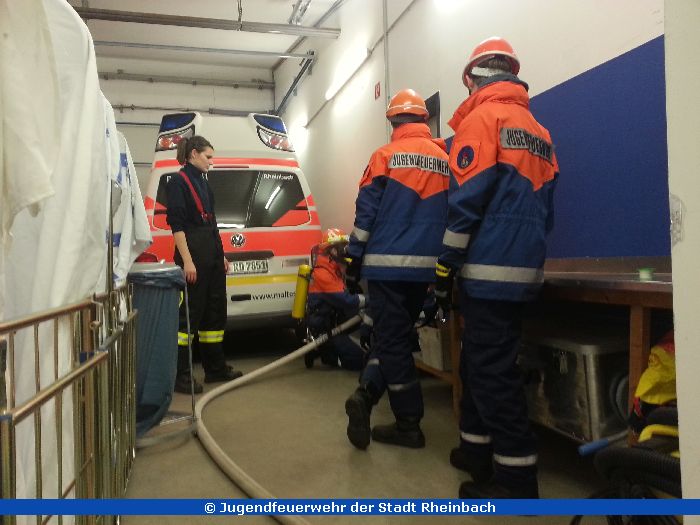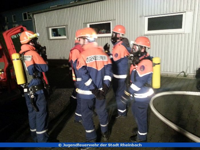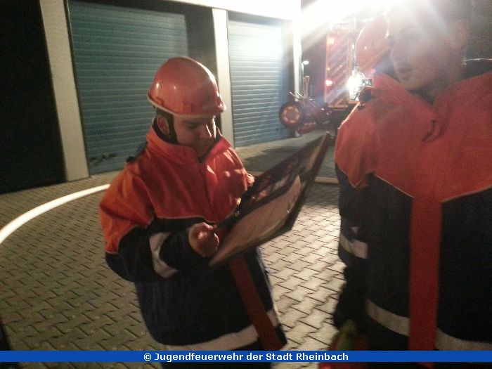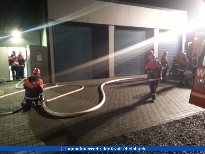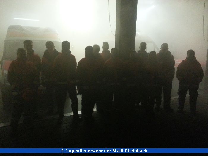 Woche vier bildete den Abschluss des Themenblockes mit der alljährlichen "Jahresabschlussübung". Diese fand dieses Jahr auf der Rettungswache in Rheinbach statt. Mit der Nebelmaschine wurden die Waschhalle und die Anbauhalle verraucht. Damit auch jeder etwas zu tun hatte, musste in der Waschhalle das "Feuer" bekämpft und eine Ausbreitung des Rauches verhindert werden. Im zweiten Einsatzabschnitt alt es, eine vermisste Person mit Hilfe der Wärmebildkamera zu suchen. Nach dem eigentlichen Durchlauf, durfte natürlich jeder nocheinmal mit Wasser am Rohr vorgehen und die Person suchen.