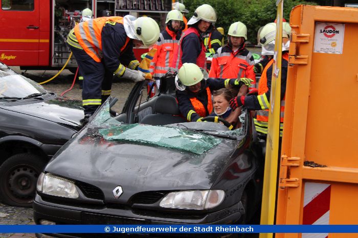 Während des Tages wurden mehrere Schauübungen präsentiert. So zeigten die Löschgruppen Wormersdorf und Hilberath – in Verbindung mit dem Geburtstagskind, der Jugendfeuerwehr Rheinbach Kern – eine patientengerechte Rettung aus einem verunfallten PKW.