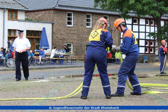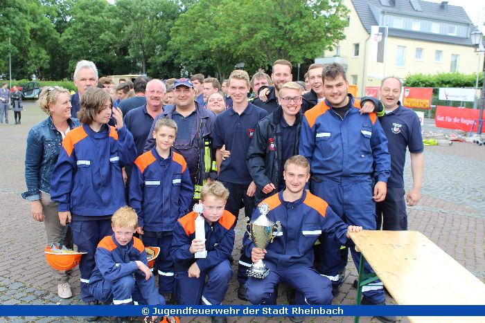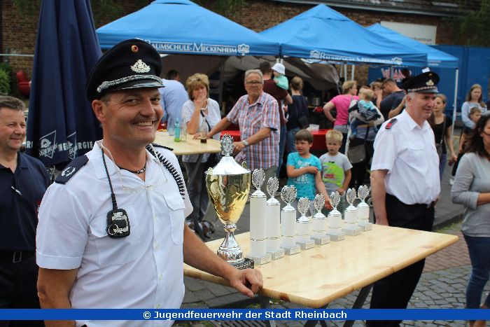 Bürgermeister Stefan Raetz nahm anschließend die Siegerehrung vor. Mit einem Schmunzeln überreichte er die Pokale für die ersten beiden Plätze: „Die Jugendfeuerwehr Rheinbach Kern präsentiert sich zu ihrem Geburtstag als guter Gastgeber: sie begnügt sich mit Platz 2 und überlässt somit den ersten Platz der Jugendfeuerwehr-Gemeinschaft aus Queckenberg und Neukirchen.“ Den dritten Platz sicherte sich die Jugendgruppe aus Ramershoven.
