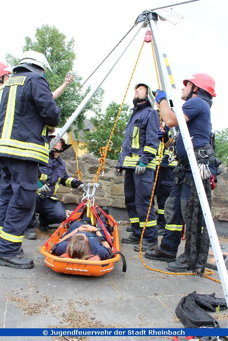 Die Absturzsicherungsgruppe der Feuerwehr Rheinbach demonstrierte das Sichern einer verletzten Person am Windmühlenturm und die Löschgruppe Neukirchen zeigte einen Innenangriff am Brandhaus.